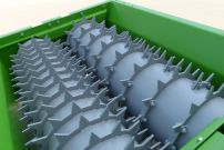 Two shafts, running at different speeds and running in opposite directions, are used to initiate the shredding process of the PRESTO cardboard shredder type PPZ and PZB. Two motors with different outputs act as drive systems. The bulk of the cardboard is shredded between the two shafts into small pieces. Then it is arranged for further preparation in a PRESTO compactor. The material throughput reaches an average of 180 m3/hr, depending of material type and feeding version.