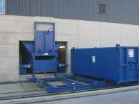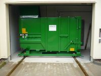 Le bac de compactage à poste fixe ou l'autopresse pour container est placé sur son propre support massif. Ce support en acier est déplacé au moyen de roues à boudins sur des rails pour grue. L'unité est entraînée par moto-frein à réducteurs.